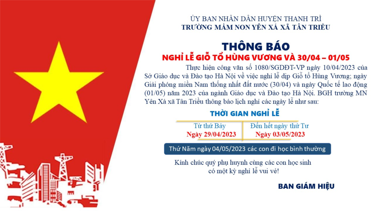 Thực hiện công văn số 1080/SGDĐT-VP ngày 10/04/2023 của Sở Giáo dục và Đào tạo Hà Nội về việc nghỉ lễ dịp Giỗ tổ Hùng Vương; ngày Giải phóng miền Nam thống nhất đất nước (30/04) và ngày Quốc tế lao động (01/05) năm 2023 của ngành Giáo dục và Đào tạo Hà Nội. BGH trường MN Yên Xá xã Tân Triều thông báo lịch nghỉ các ngày lễ như sau: